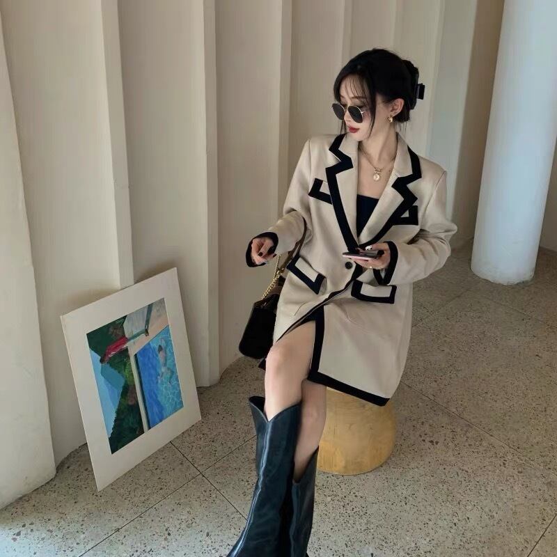 black line beige jacket